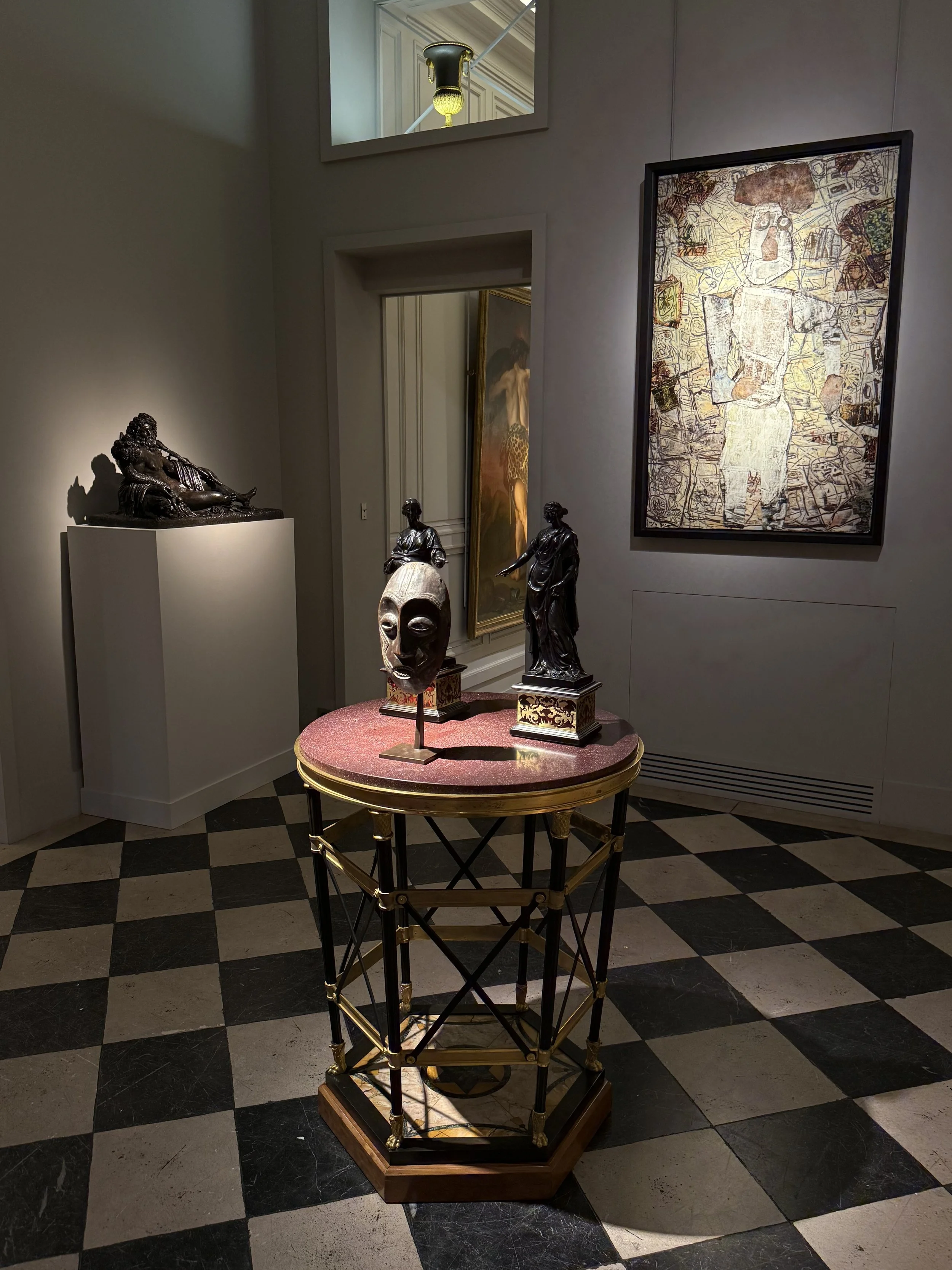 Extraordinary booth in collaboration with Gabriel & Guillaume for The Salon @Park Armory November 2021 featuring Georges Condo, a unique custom Sideboard by Joaquim Tenreiro, an armchair and ottoman by Abraham Palatnik, a bonze side table by Ranya Sarakbi & Niko Koronis, ceramic by atelier Nakima.